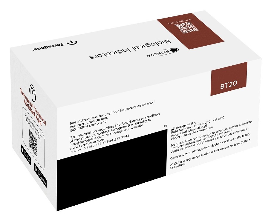Indicatore biologico autonomo per processi di sterilizzazione a vapore. Geobacillus stearothermophilus (ATCC® 7953, ATCC è un marchio registrato di American Type Culture Collection) 10^5 o 10^6 spore per fiala. Lettura: 24 ore. Monitoraggio dei processi di sterilizzazione a vapore con vuoto assistito e spostamento d'aria per gravità a 121-135 °C.