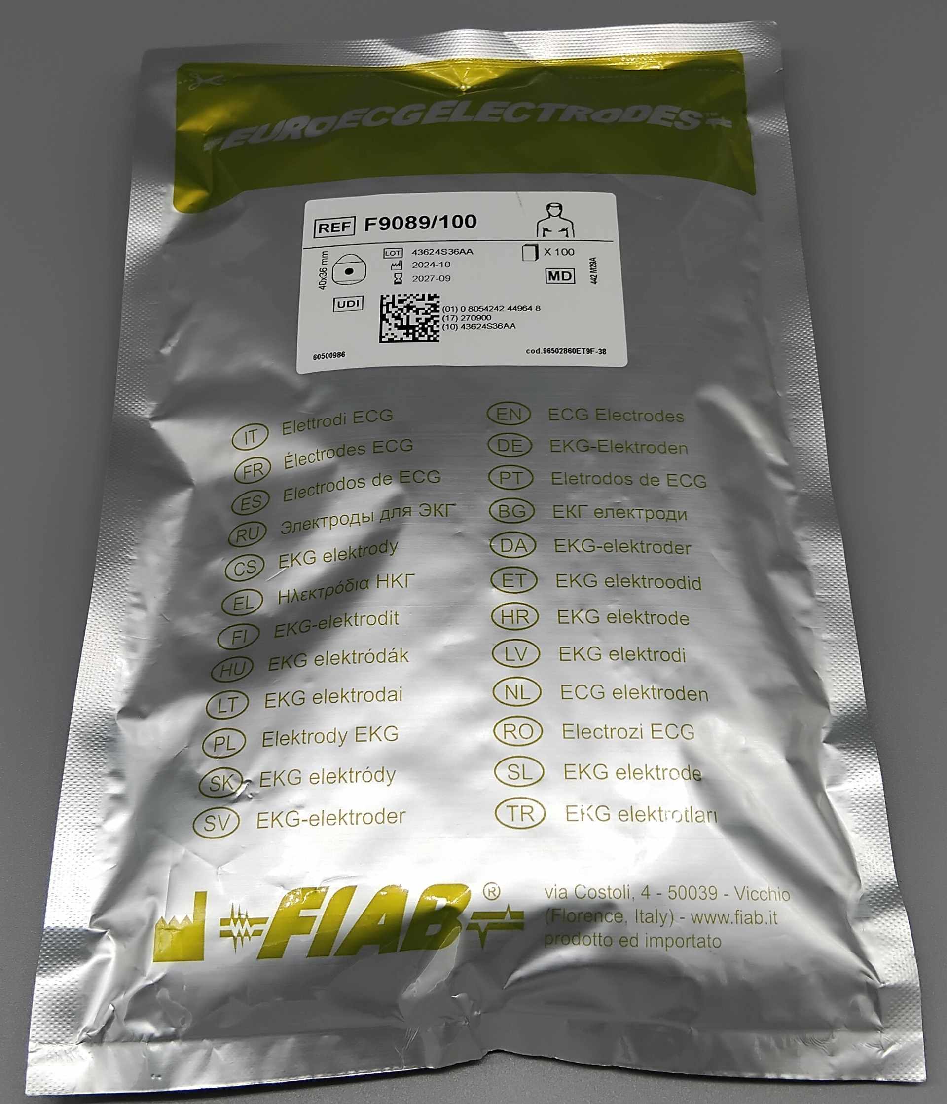Elettrodi monouso per ECG in GEL solido con sensore in Ag/AgCL (Argento/Argento Cloruro) e clip in acciaio. Misura 40x36mm - versione adulti.