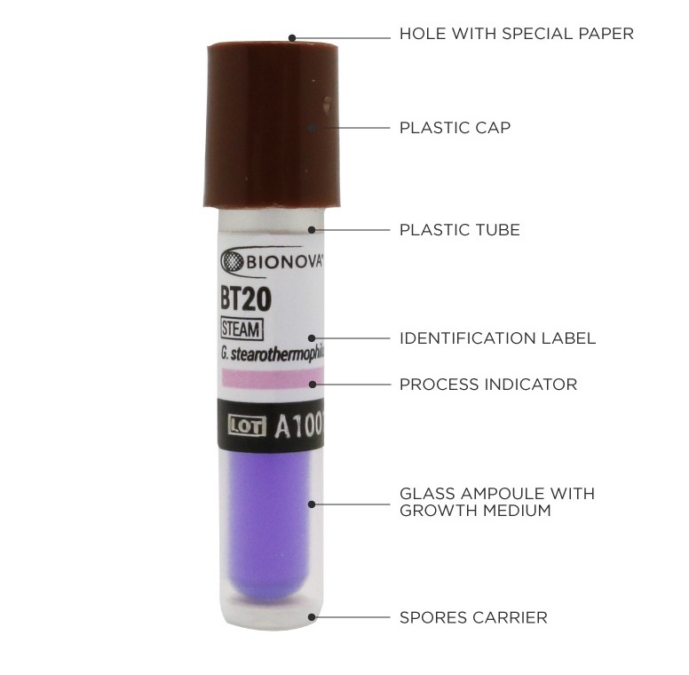 Indicatore biologico autonomo per processi di sterilizzazione a vapore. Geobacillus stearothermophilus (ATCC® 7953, ATCC è un marchio registrato di American Type Culture Collection) 10^5 o 10^6 spore per fiala. Lettura: 24 ore. Monitoraggio dei processi di sterilizzazione a vapore con vuoto assistito e spostamento d'aria per gravità a 121-135 °C.